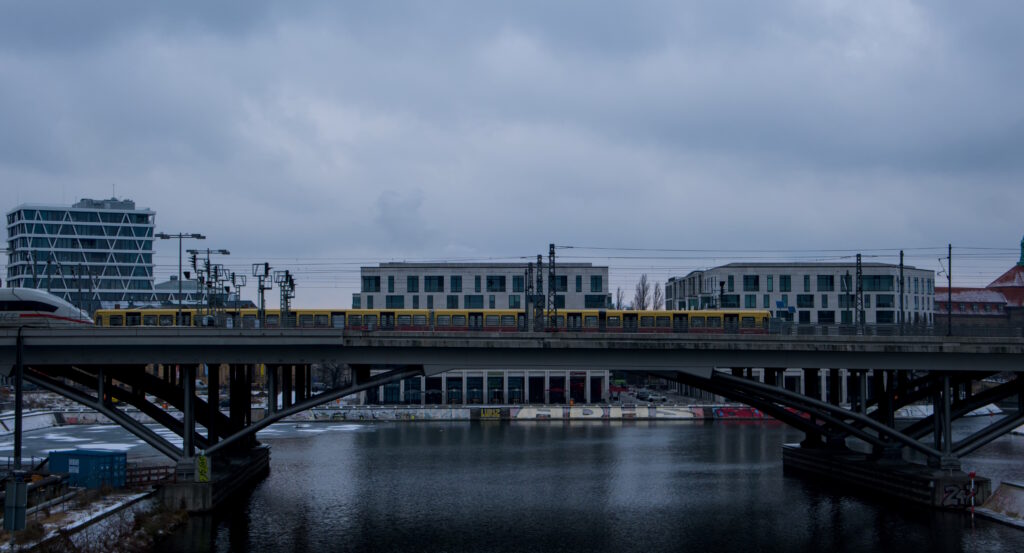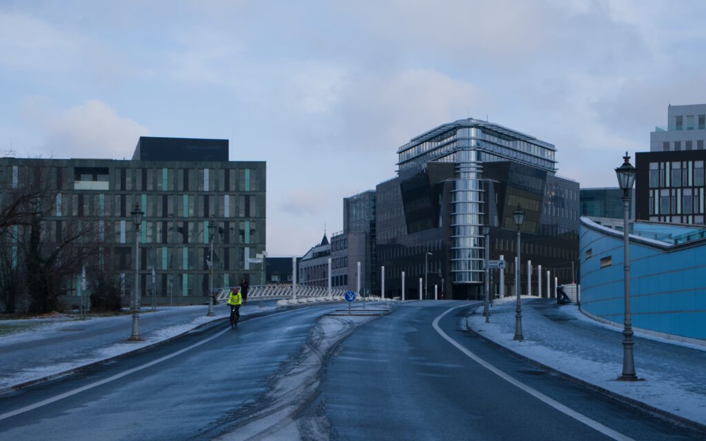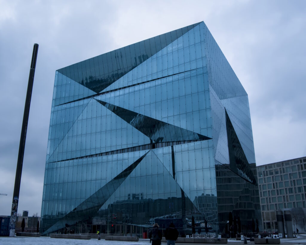 Two dark tiled buildings. Front building has round glass elements reflecting the mostly blue sky